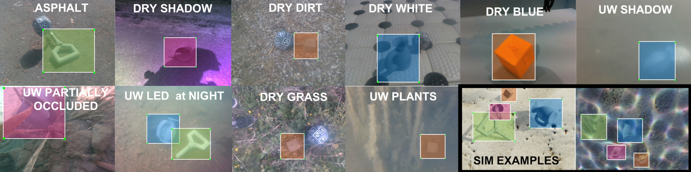 We have developed a comprehensive dataset for object detection and 6D pose estimation in both underwater and dry environments, comprising both synthetic and real-world data. The dataset focuses on four objects of interest for underwater intervention.
